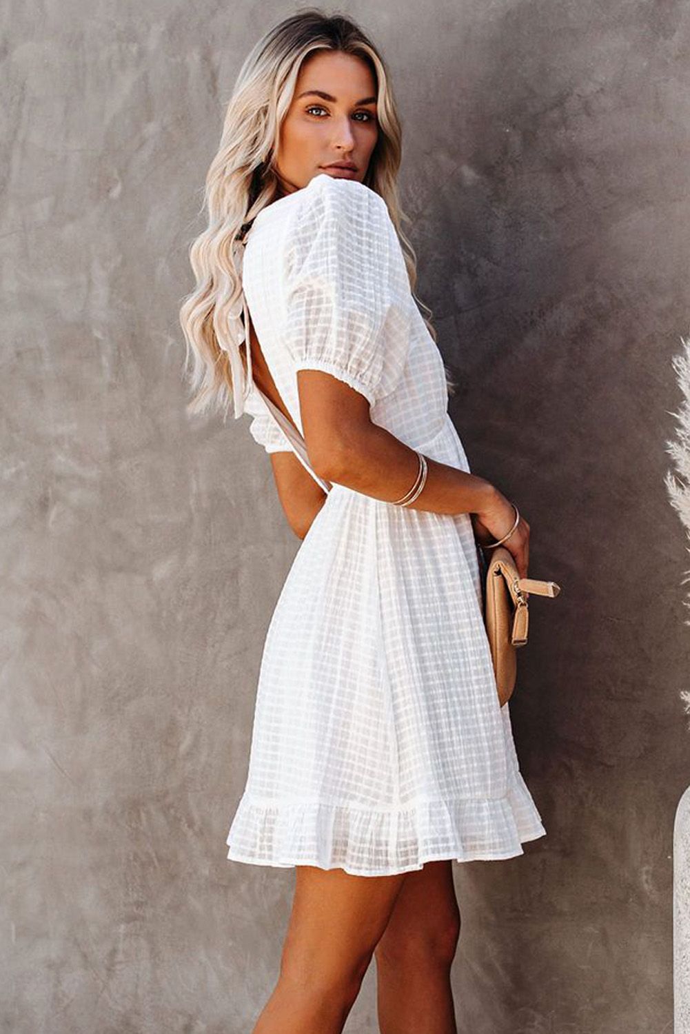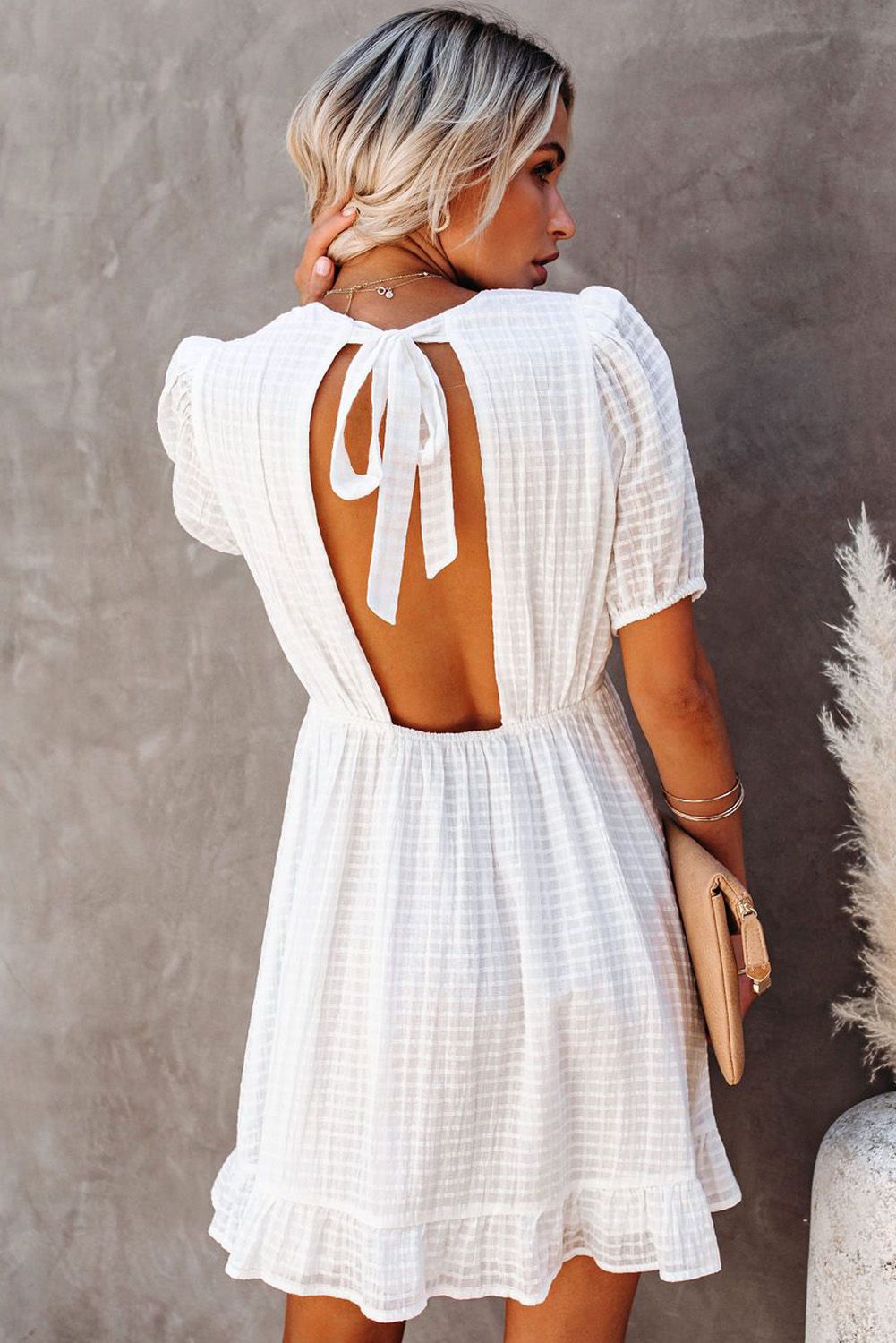 Ruffle trim and a back cut out detail the look with a sweet vibe