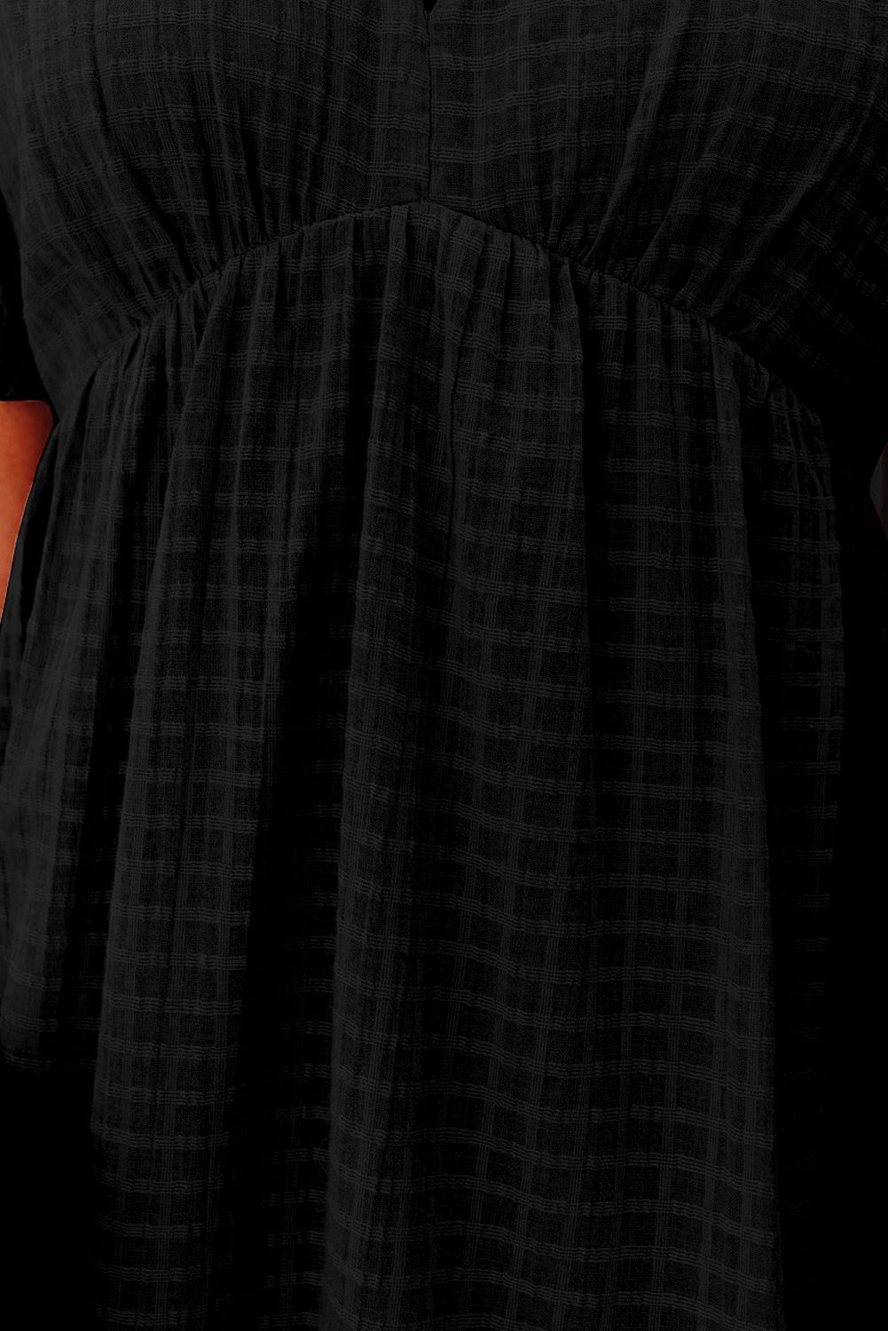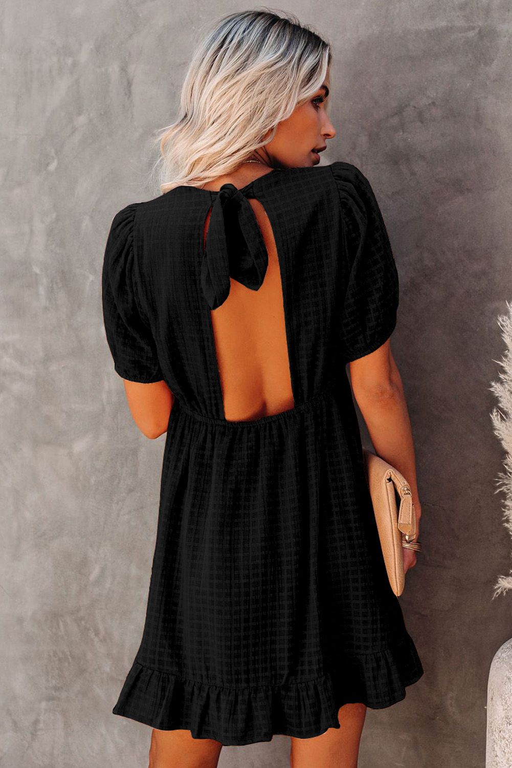 Black Checkered Pattern Puff Sleeve Babydoll Dress