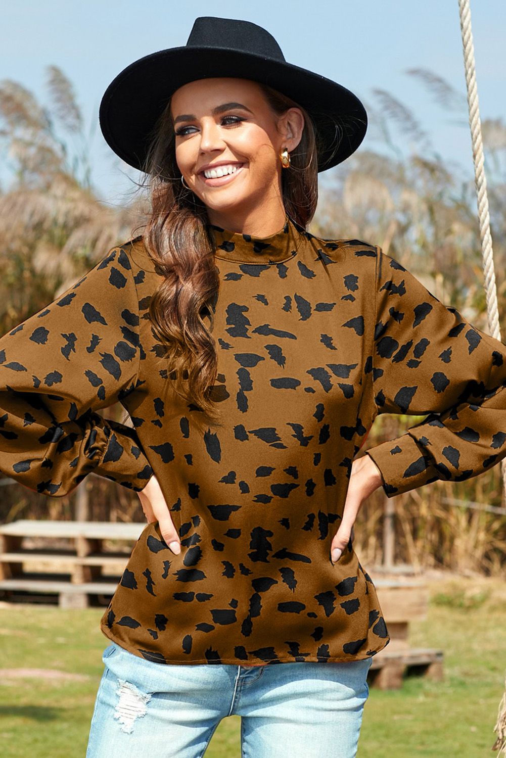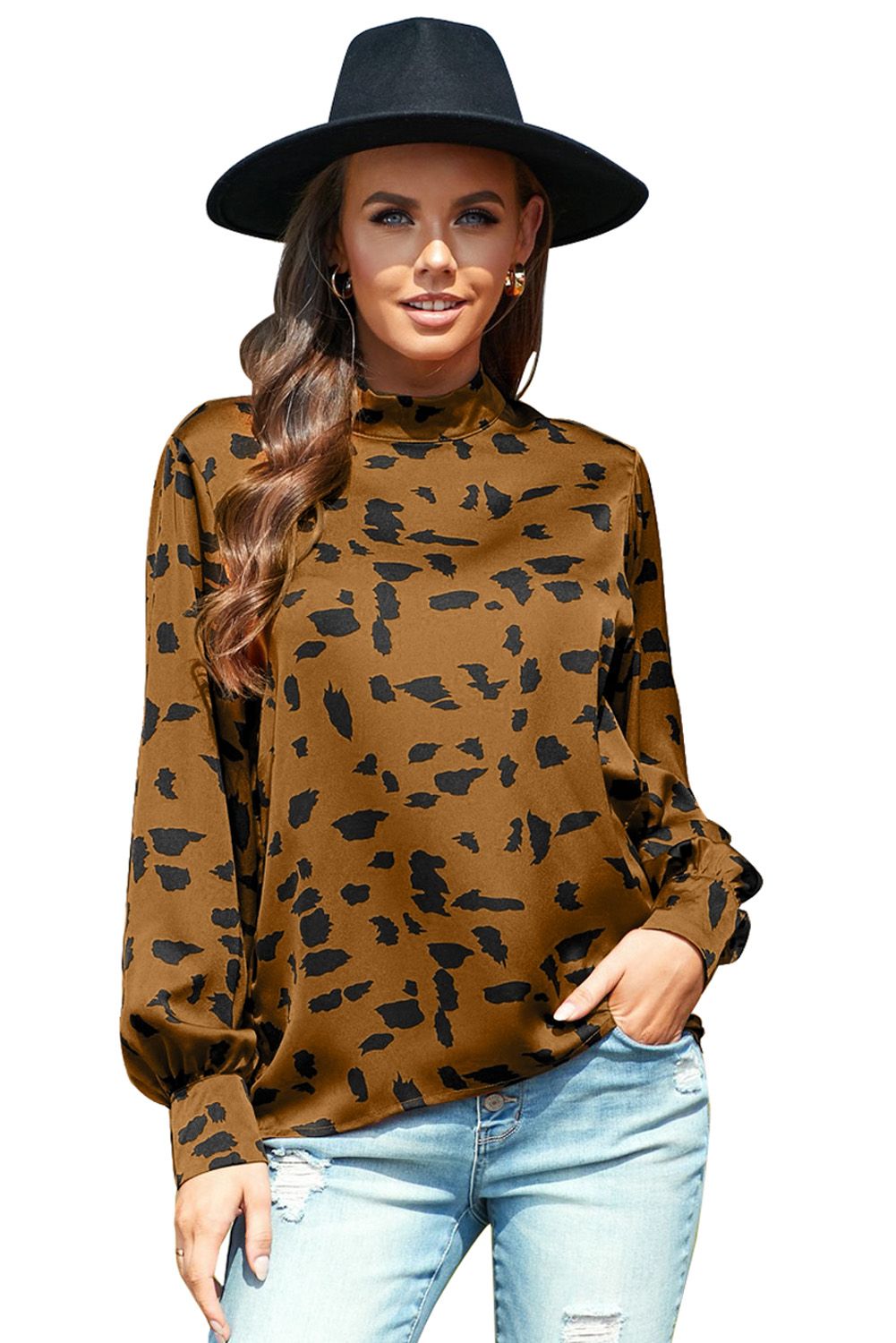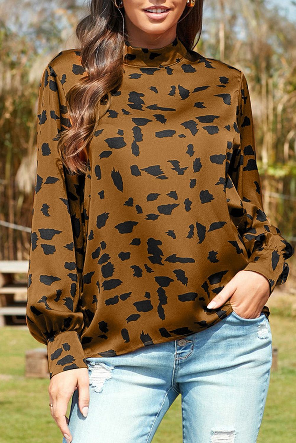 Beige Mock Neck Lantern Sleeve Fashion Print Blouse