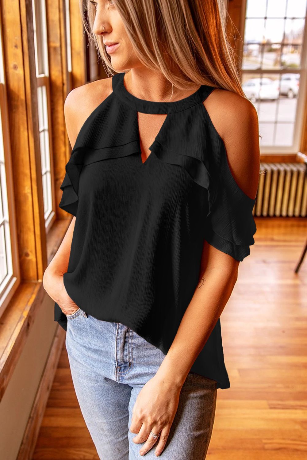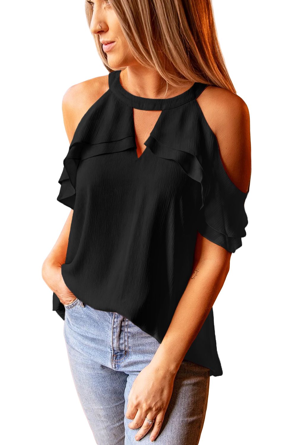 Black Ruffled Cold Shoulder Blouse