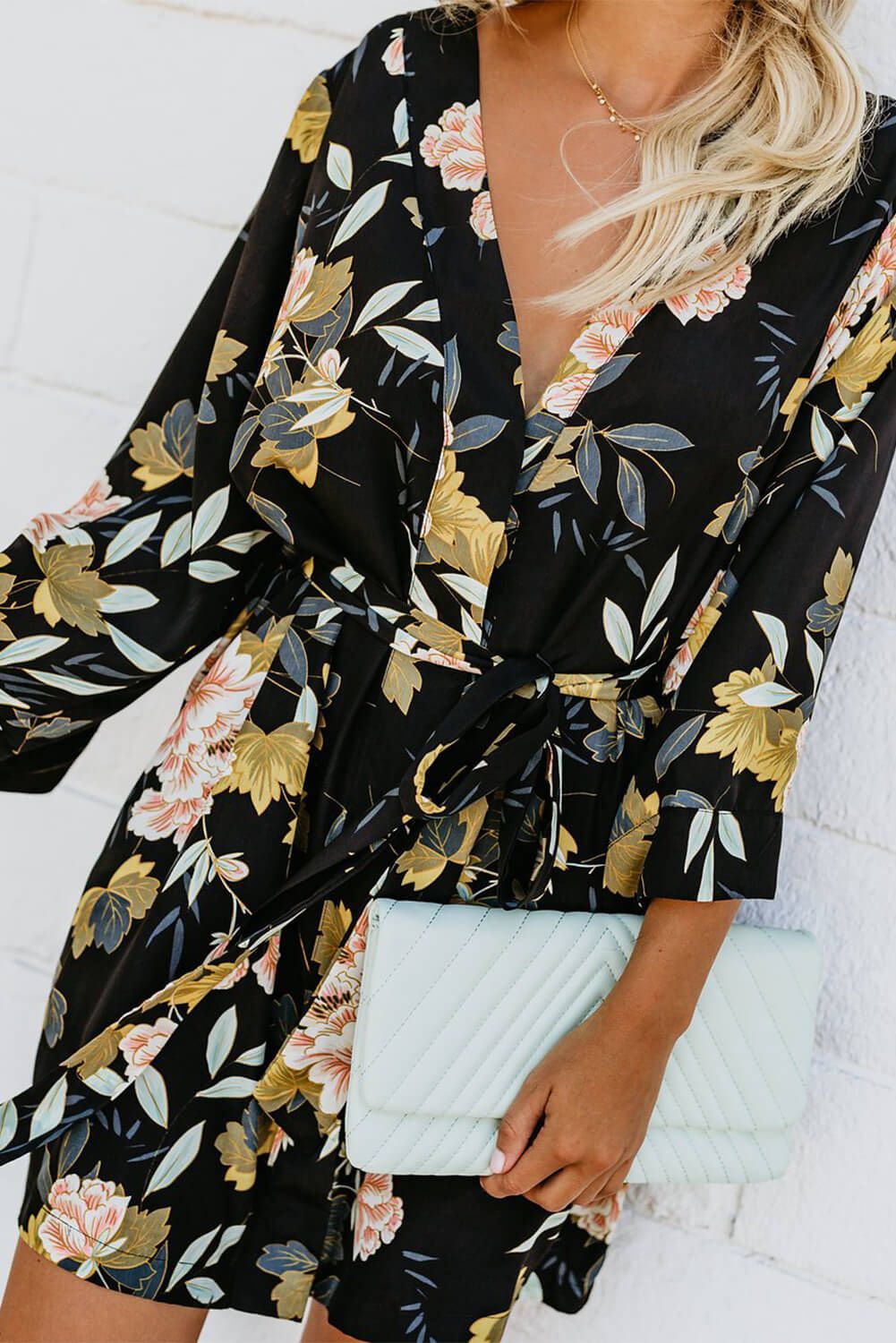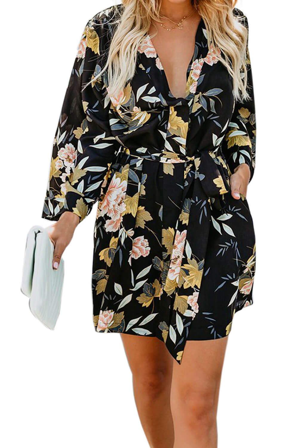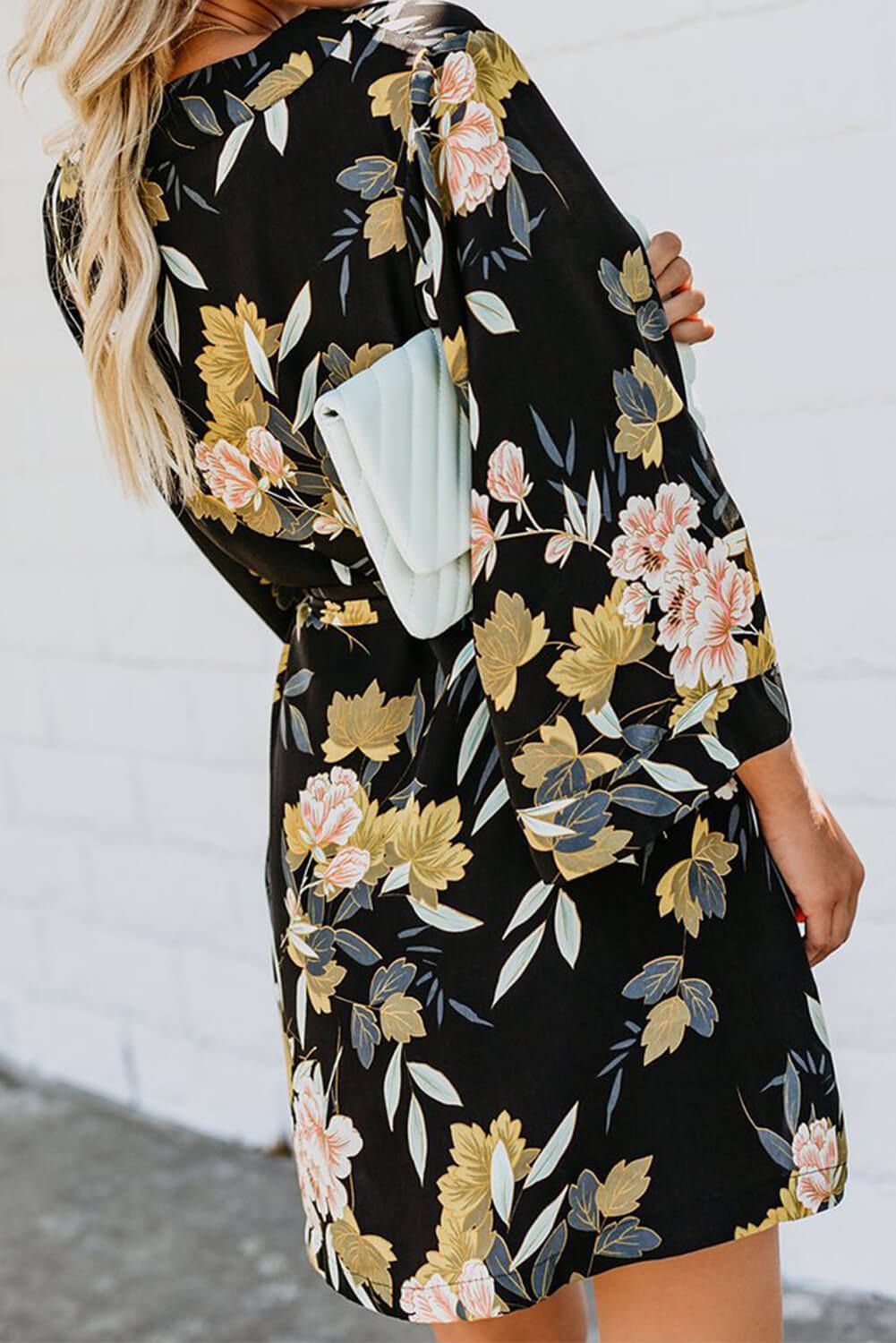 Black Casual V Neck 3/4 Sleeve Floral Dress