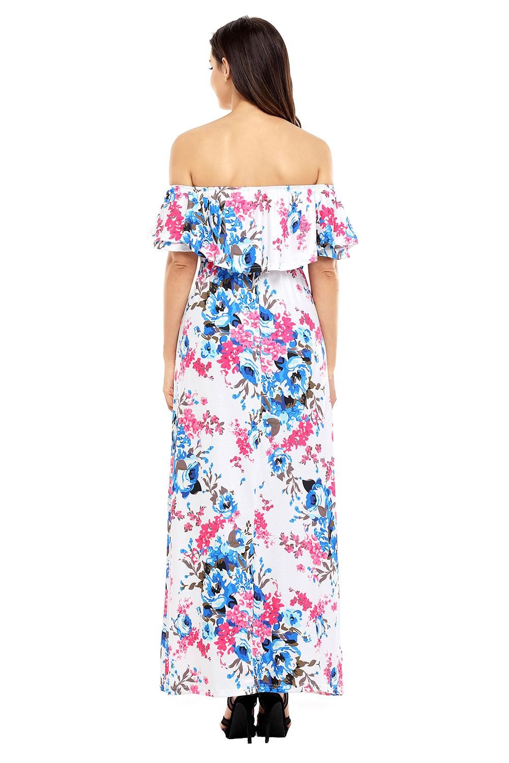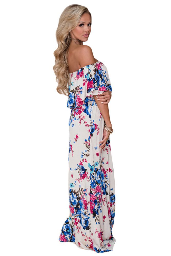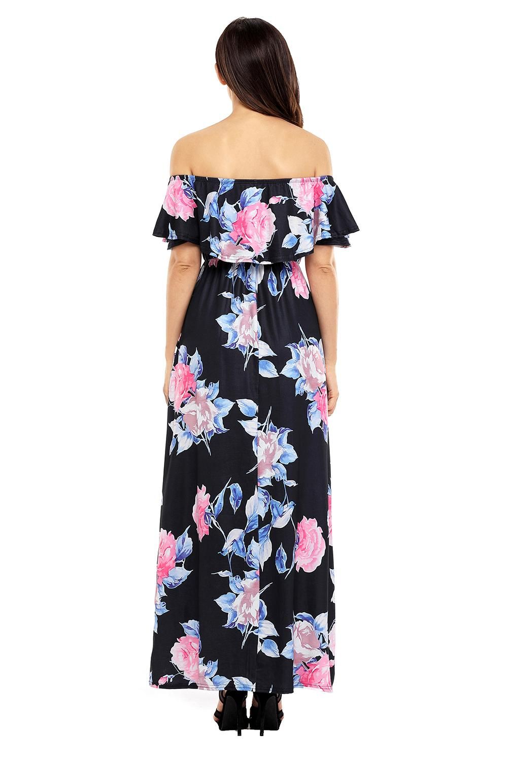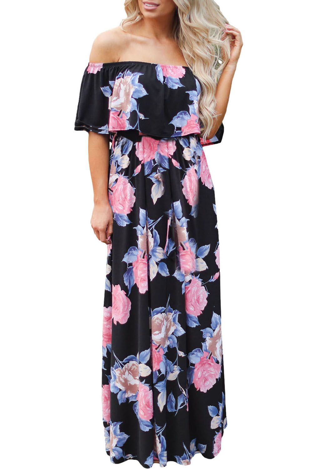Flower Print Black Grounding Off Shoulder Long Boho Dress