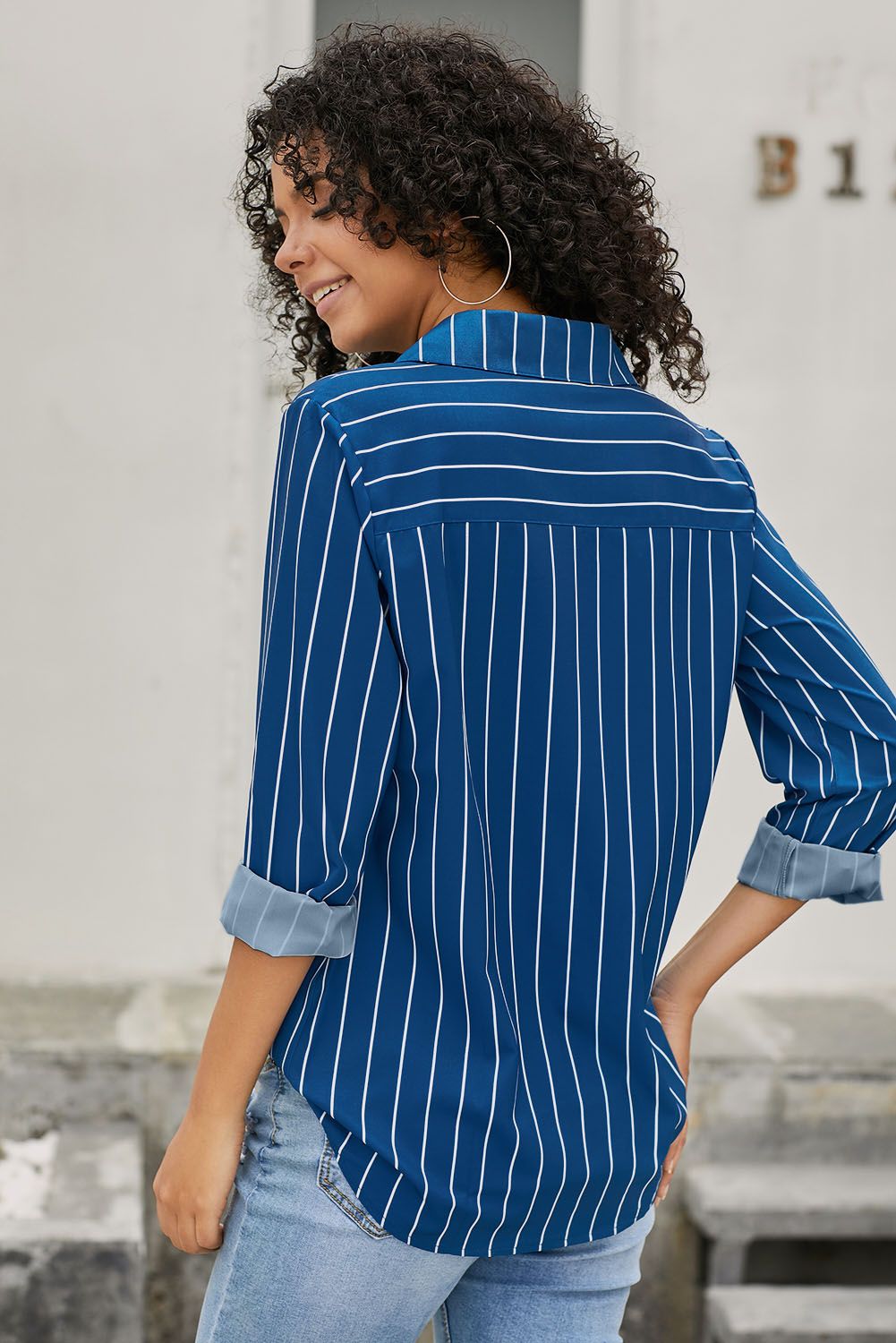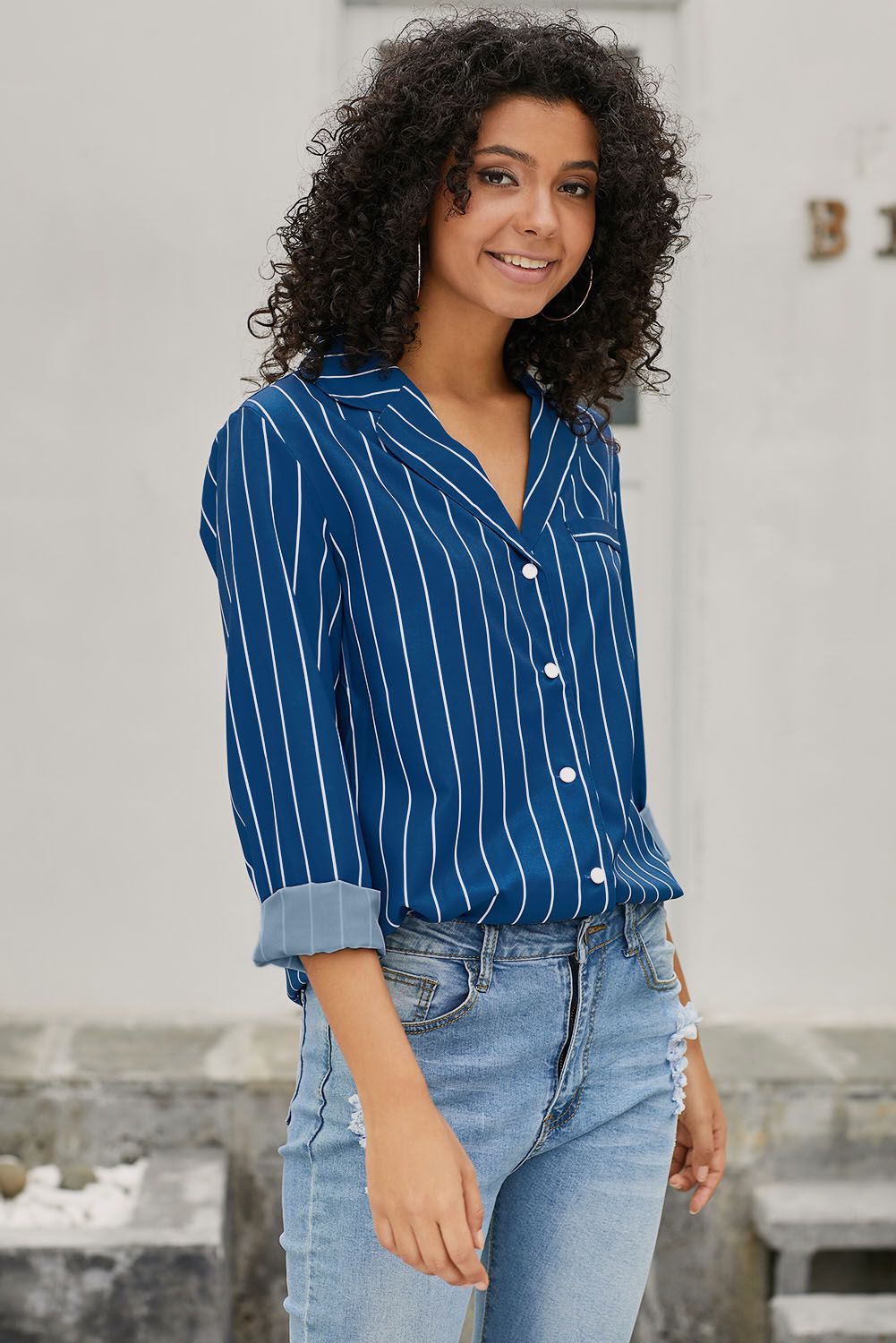 Stripe shirt with loose fit to elongate a slim figure