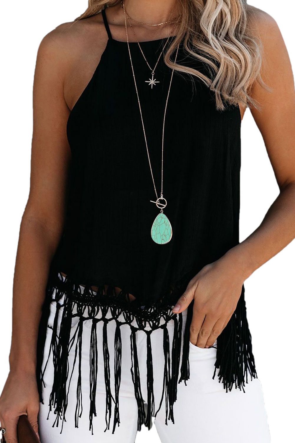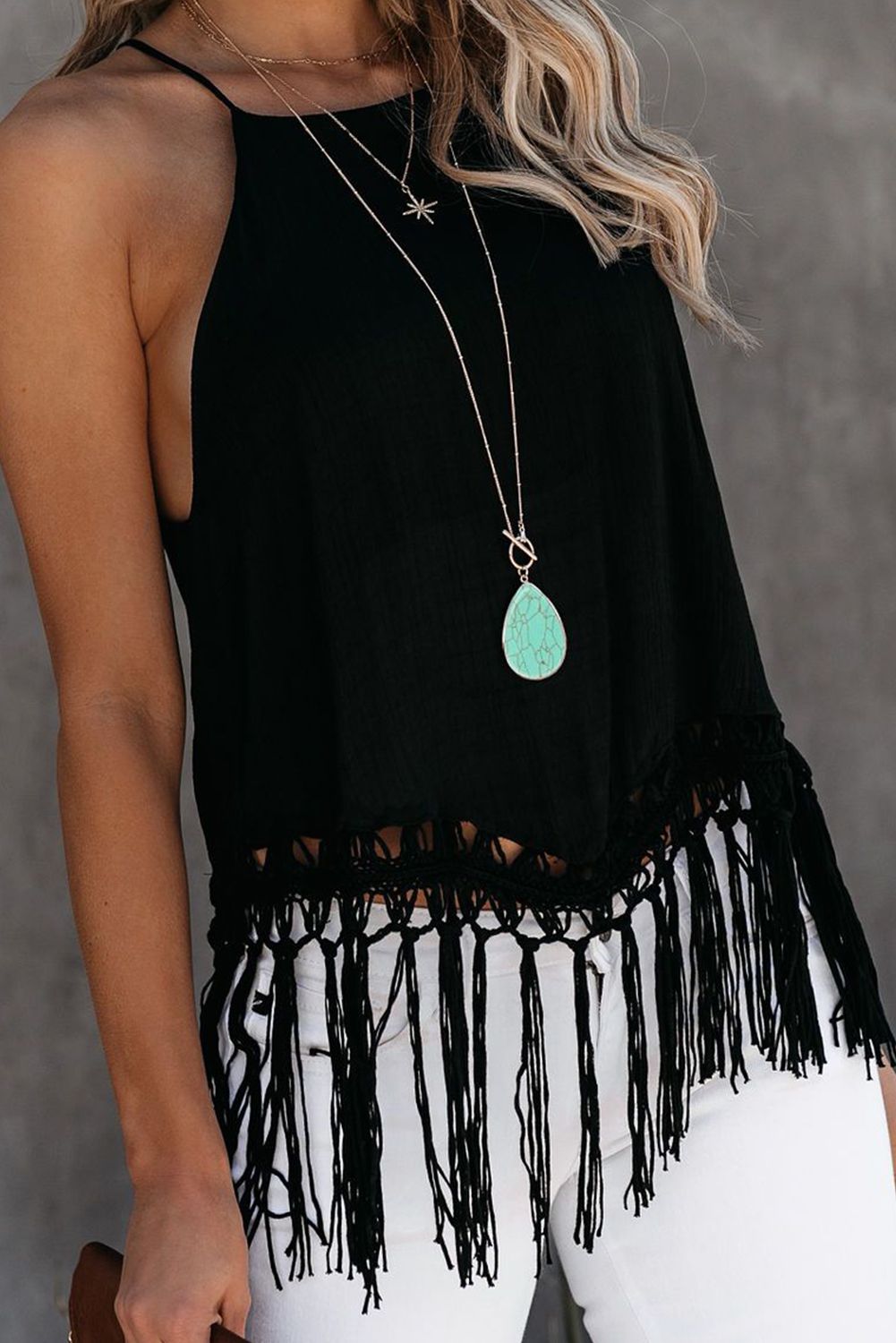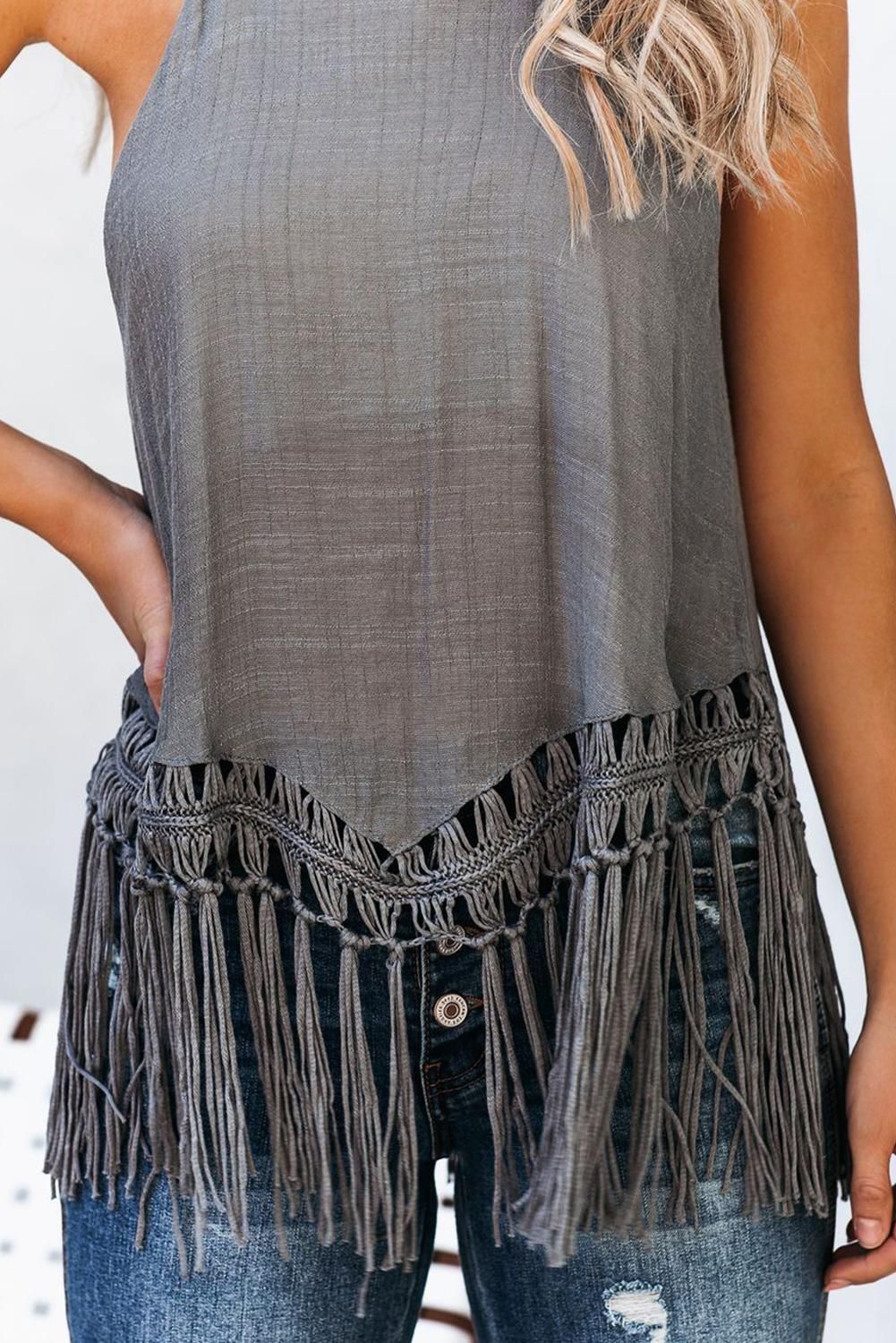 Macramé tied tassels decorate the hem of this fab tank