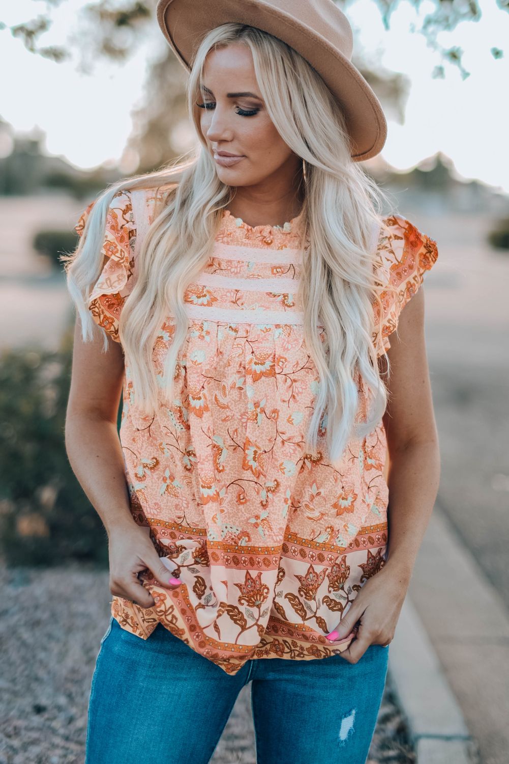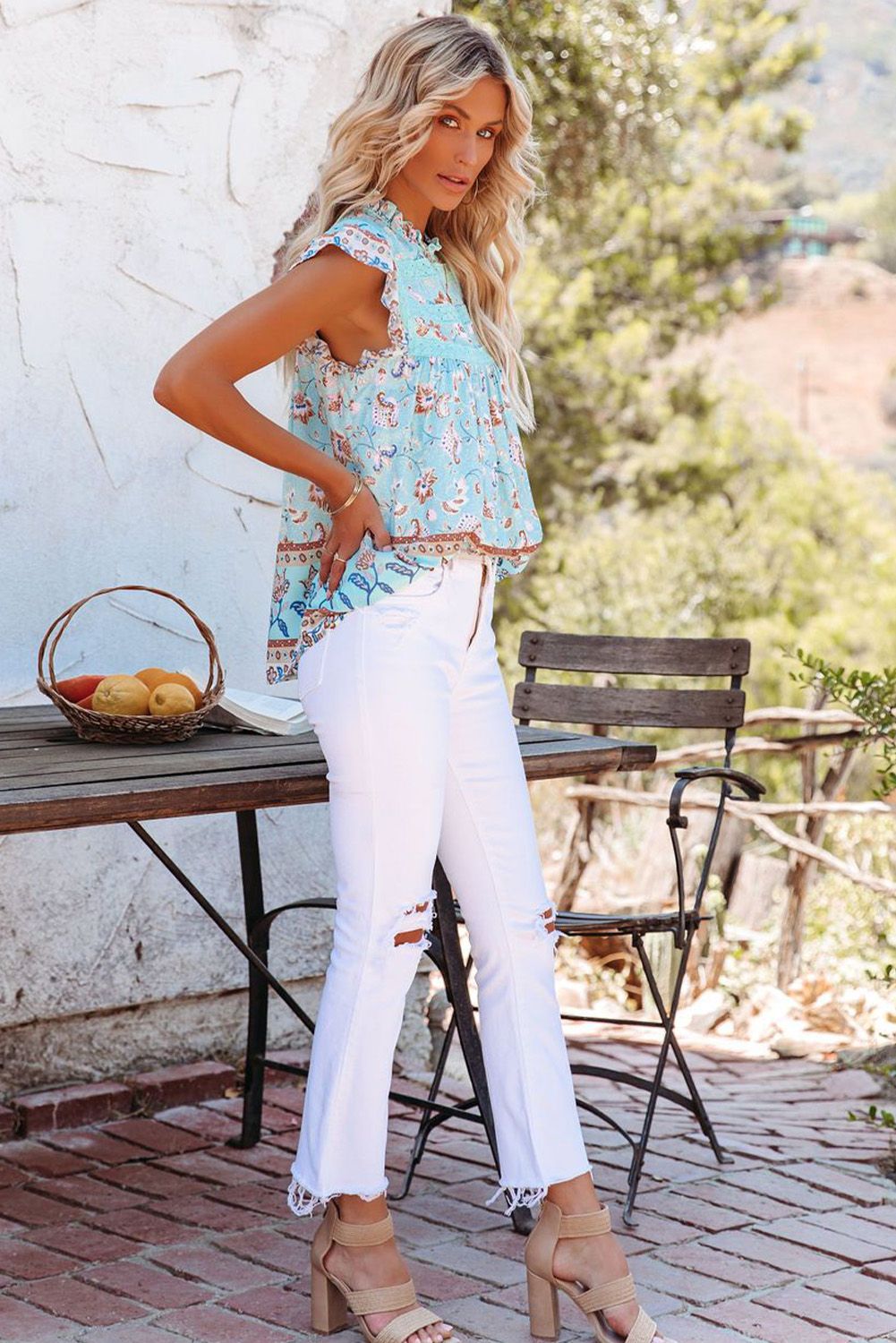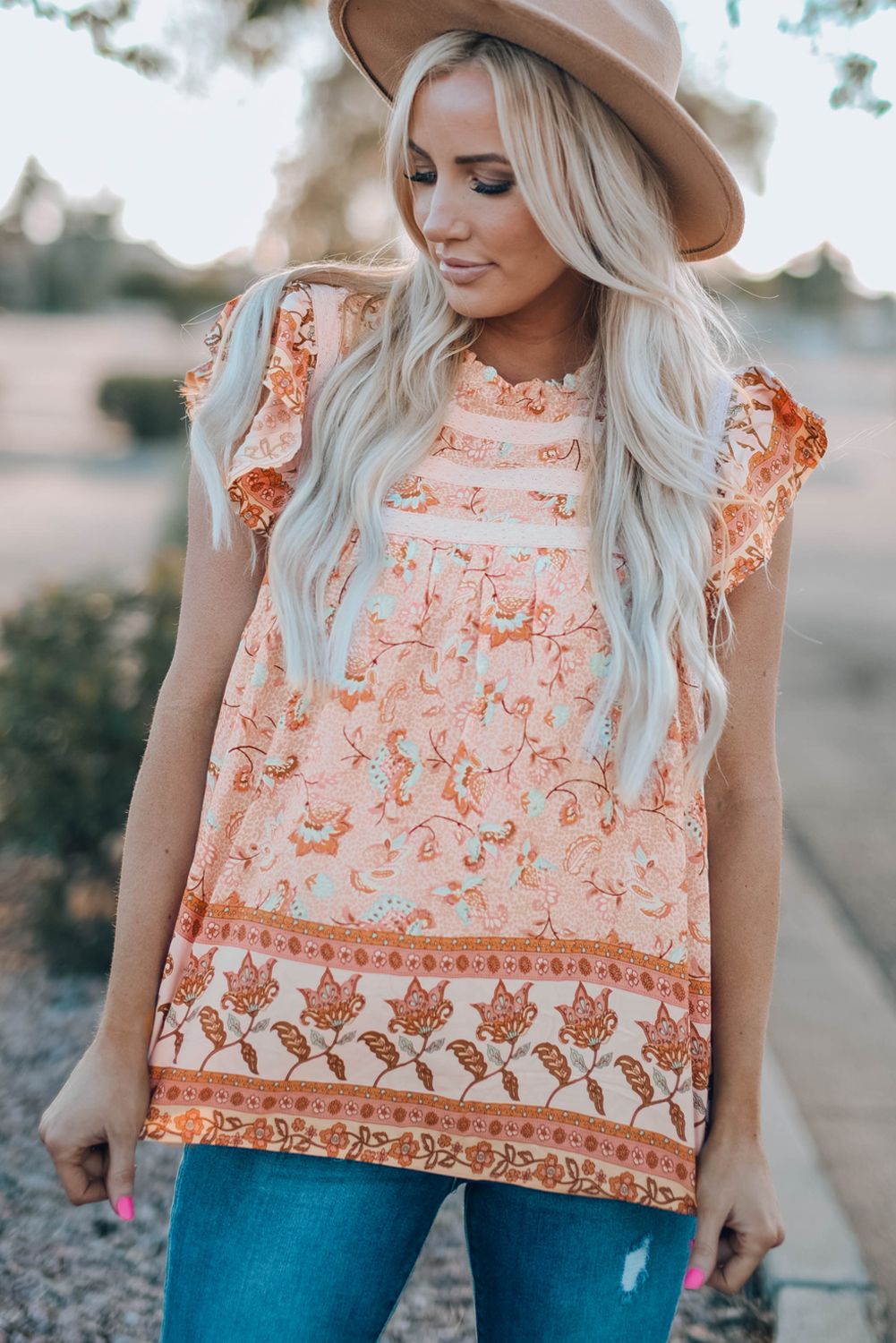 Our Floral Print Ruffled Crew Neck Sleeveless Top embodies boho vibes