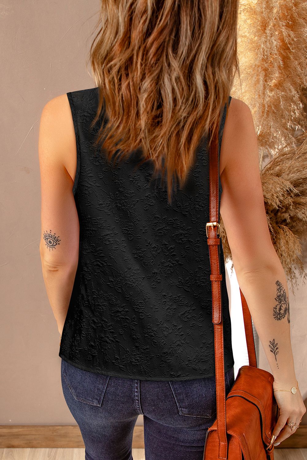 Black Floral Jacquard Scalloped V Neck Tank Top