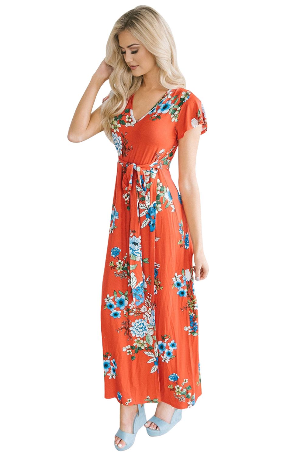 Floral maxi dress for womenCap sleeves, v neck and waist tie sashDifferent color and size options are availableShort sleeve boho dress perfect for beach vacationBoho maxi dresses cut at maxi length are especially popularWholesale boho dresses for romantic look on summer occasionsl