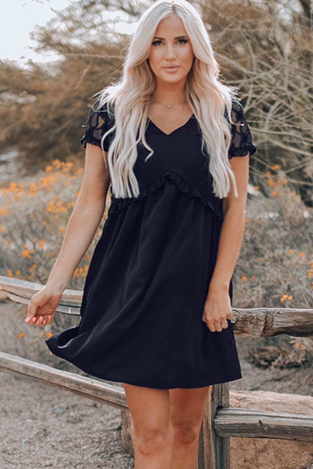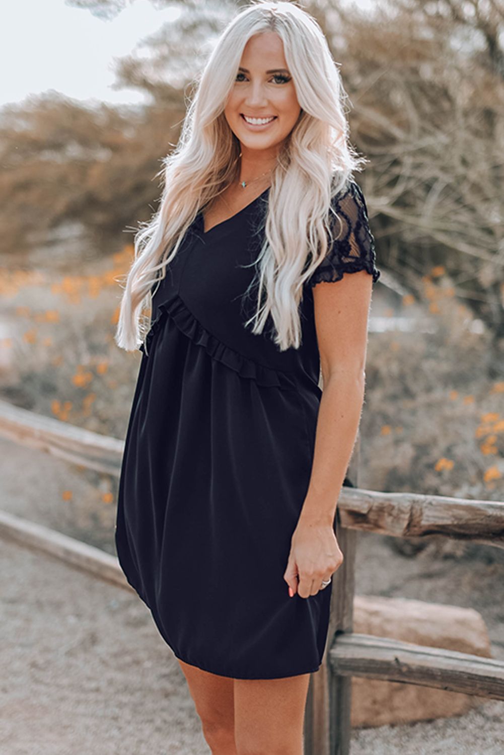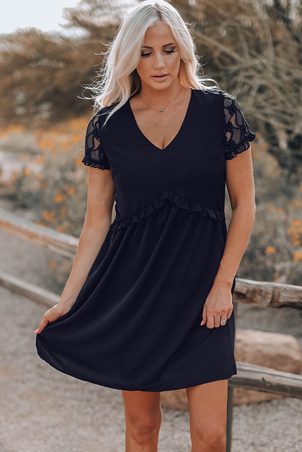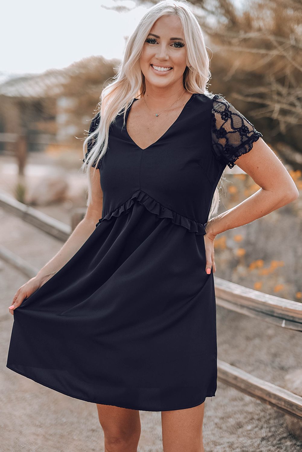 - V neck dress splices with lace sleeves, frilled detail accentuates an empire waistline