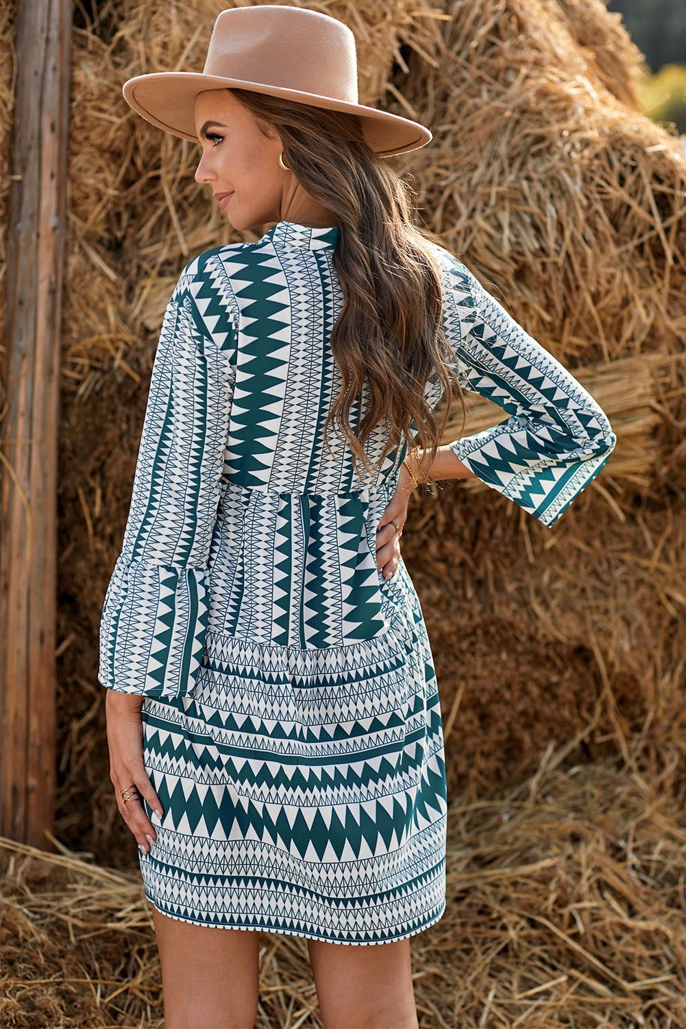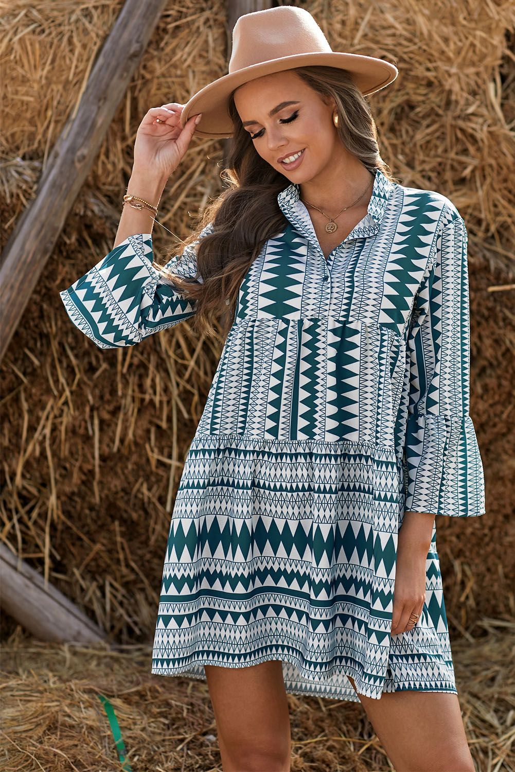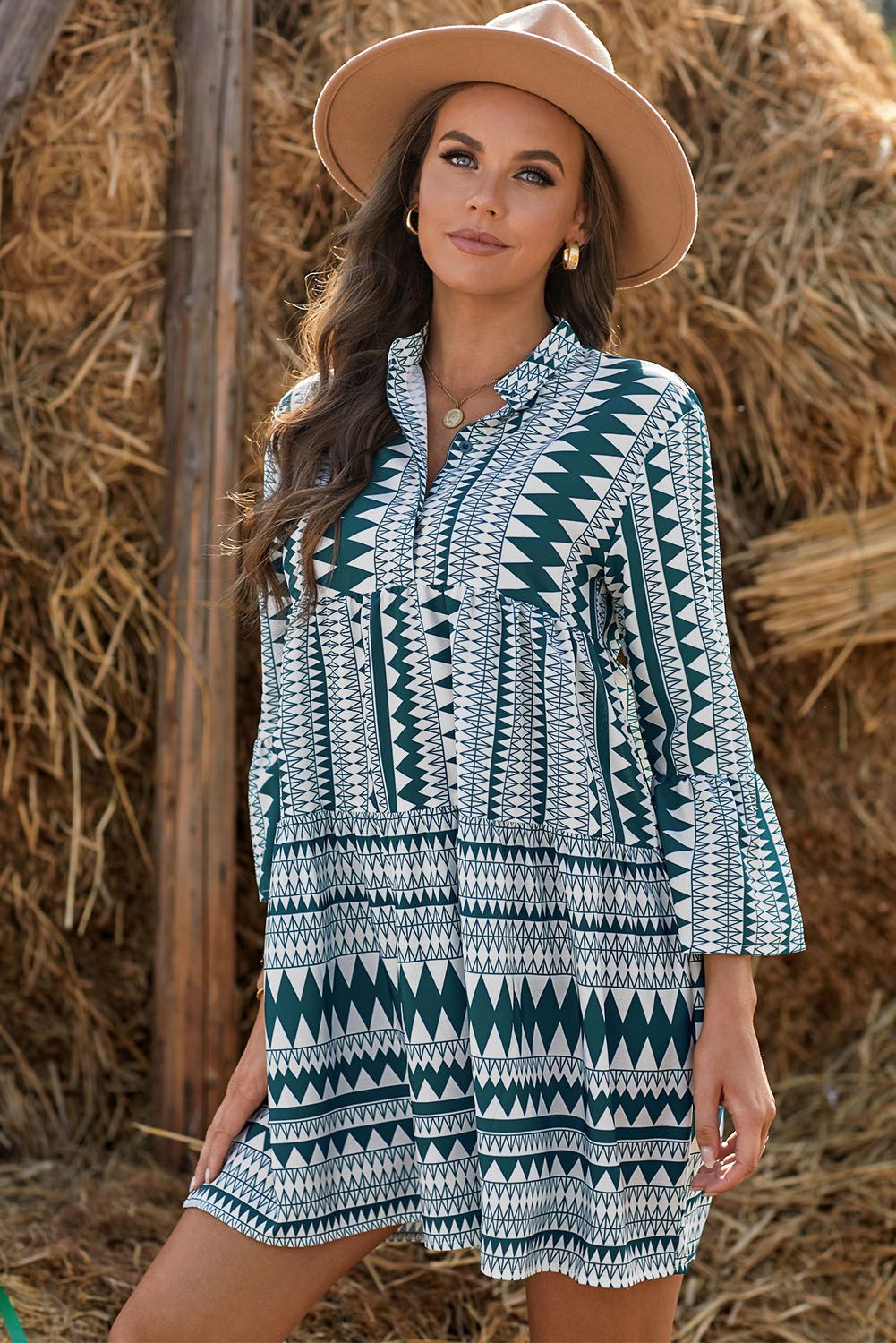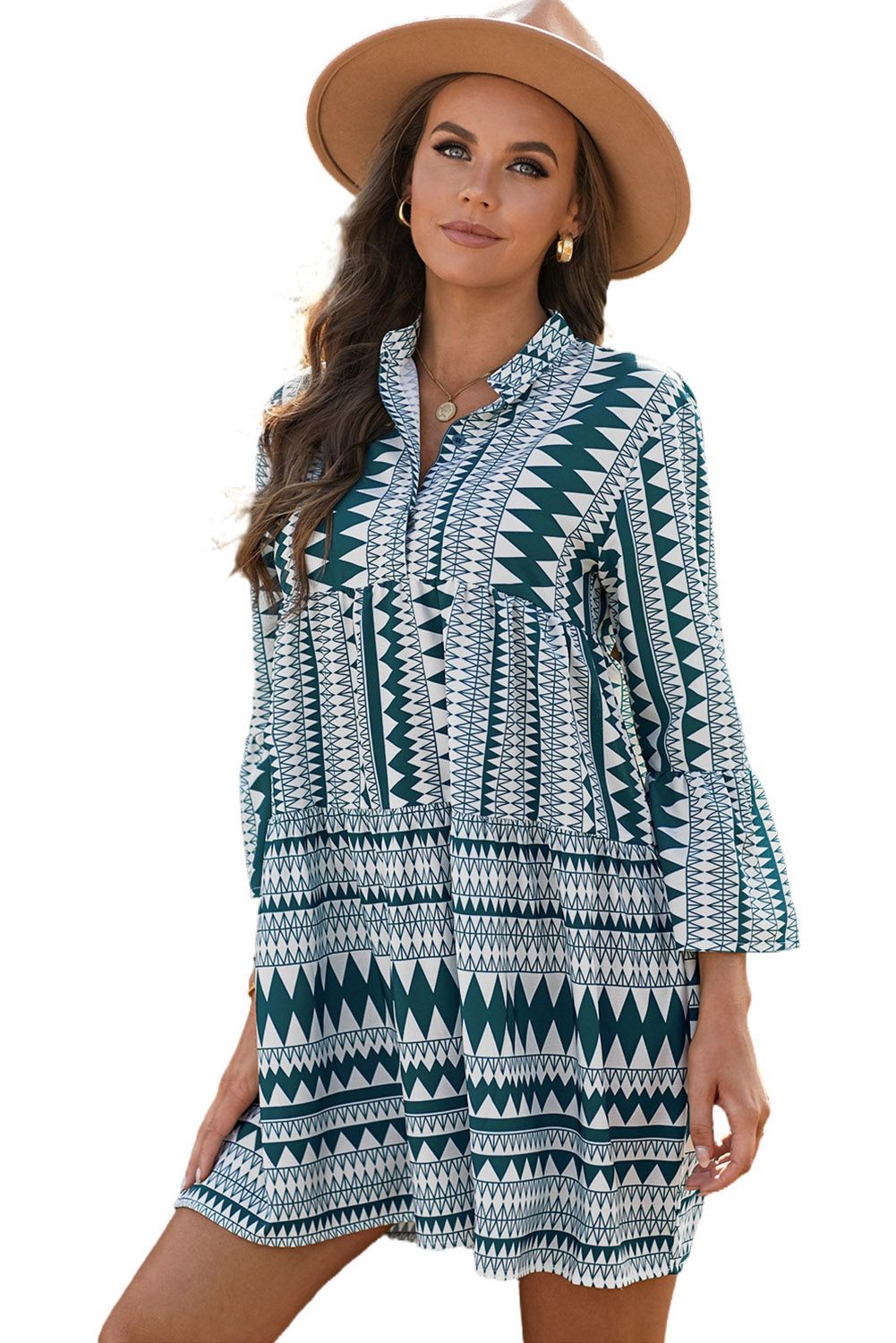 Green Collarless Flared Sleeve Bohemian Flowing Mini Dress