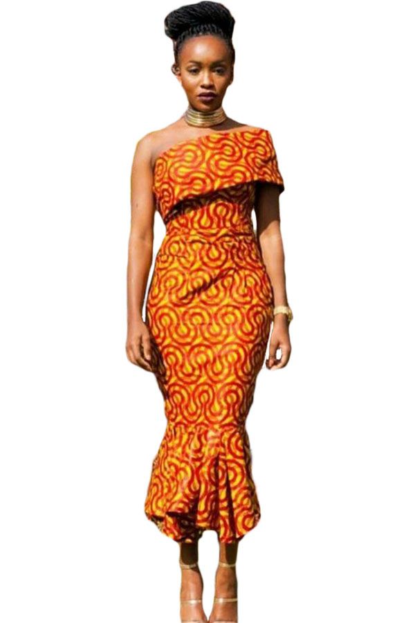Single Shoulder Mermaid Hem Africa Print Dress